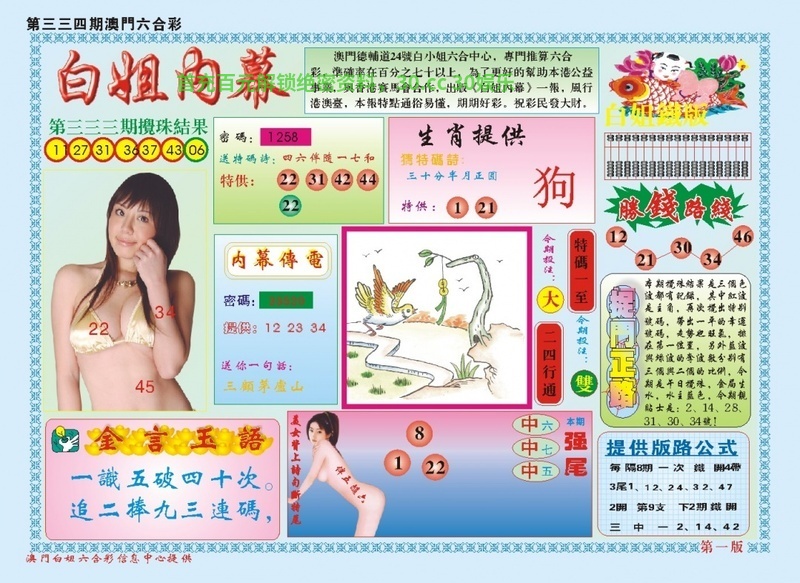 | 337期《白姐九肖》 综合九肖♘:蛇马羊鸡兔牛狗鼠猴 综合七肖♘:蛇马羊鸡兔牛狗 综合五肖♘:蛇马羊鸡兔 主攻特码♘:13.49.24.36.35.47.09.21.03.27 ![]() |